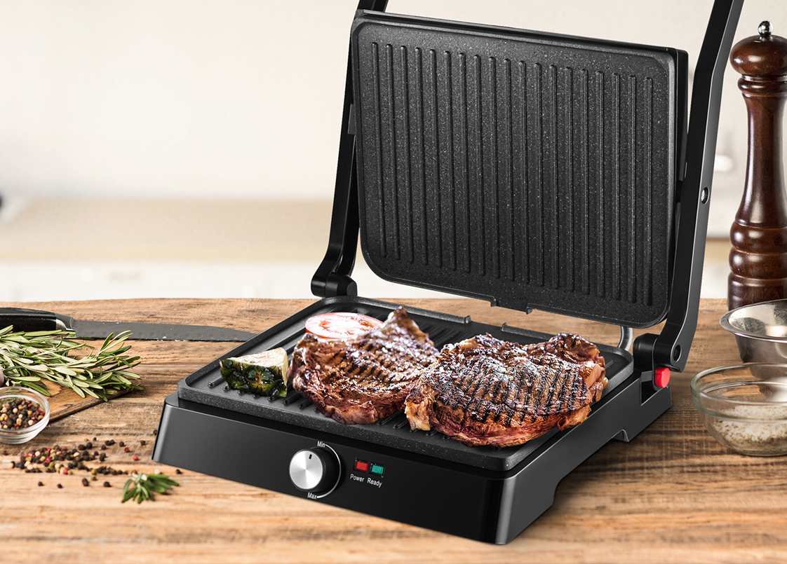 Grill MOZANO posiada płyty ze specjalną marmurkową powłoką teflonową typu „non stick”, która sprawia, że jedzenie nie przywiera oraz skraca czas czyszczenia do minimum. Urządzenie pomoże Ci wprowadzić do swojego jadłospisu zdrowe potrawy przygotowane bez dodatku tłuszczu.